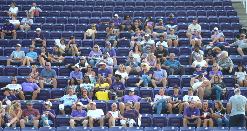 Clay Hendrix wasn’t pleased with the Paladins’ FanFest, but, after all, it was a fest. The band was playing the fight song, not to mention the unofficial numero duo, Paul Simon’s “Call Me Al,” which, by the way, I love. I’d also like occasional flourishes of the Have Gun, Will Travel (“Paladin, Paladin, where do you roam?”) theme, but then I wouldn’t get to play it on my guitar in the parking lot.