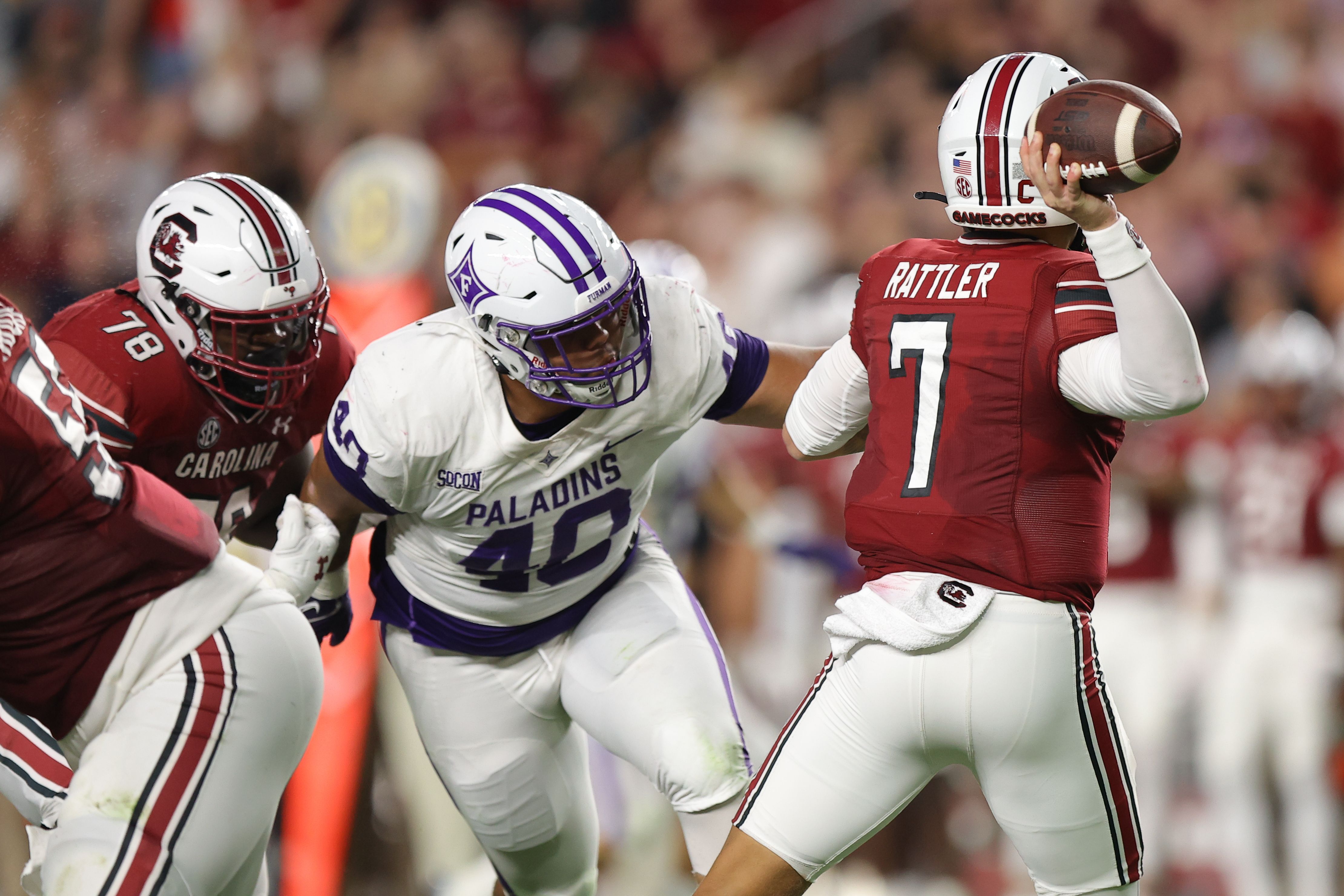Rattler, who had been sacked nine times in South Carolina’s opening-game loss to North Carolina, got off scot-free this time, though the Furman rushers sometimes got close enough to hear his rattle. He completed 25/27 passes for 345 yards and three touchdowns.