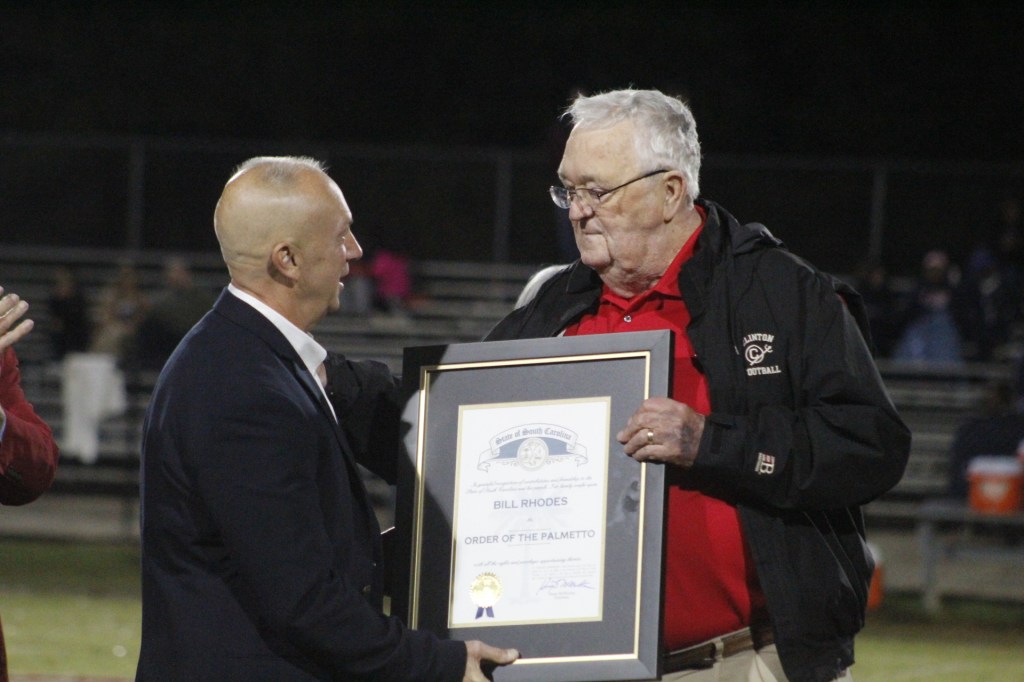 Gilliam personally delivered the Order of the Palmetto, the state’s highest honor, to Rhodes, revered throughout District 56, in halftime ceremonies.
