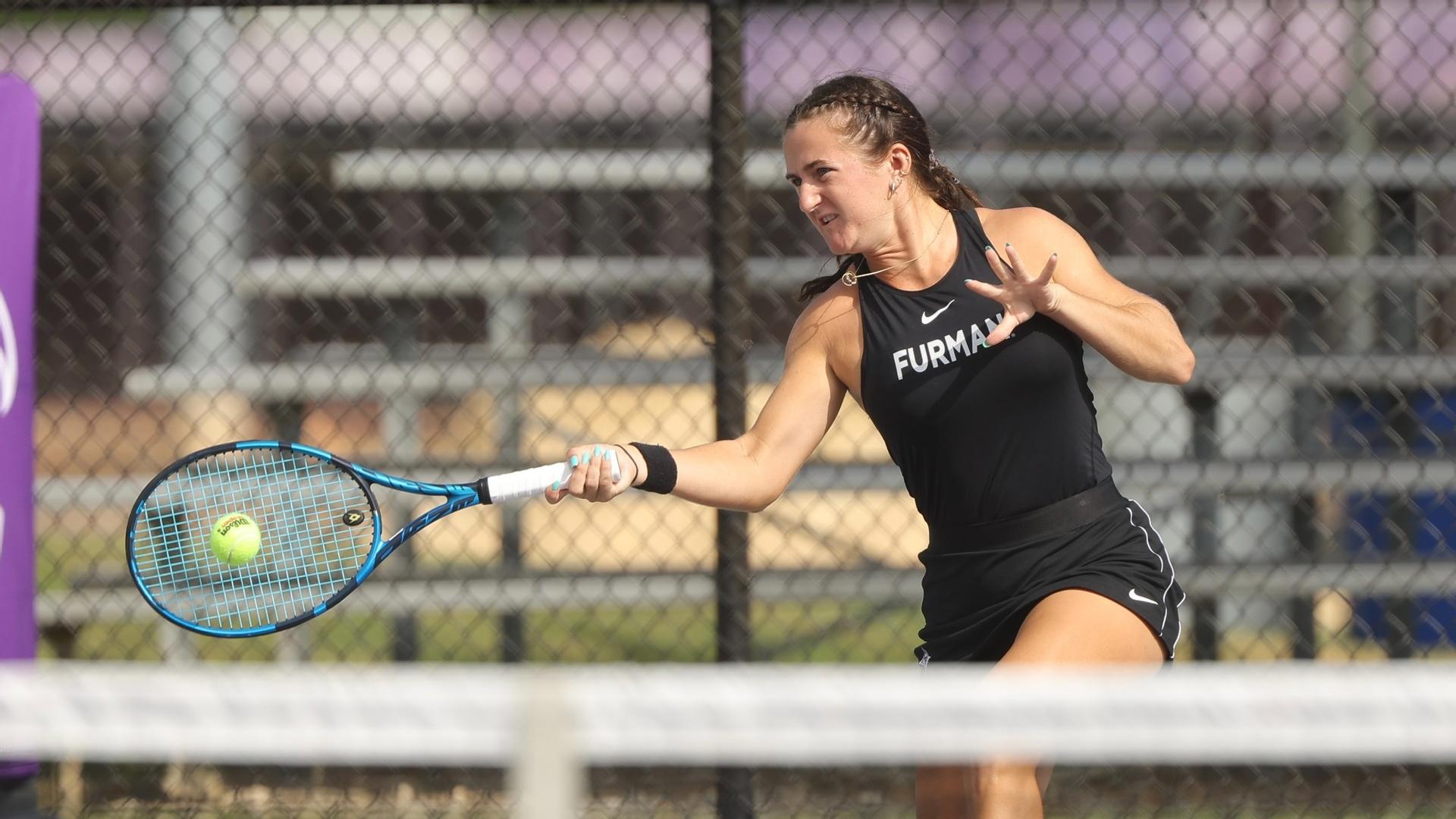 Furman swept the six singles matches, winning four in straight sets. Sara Snyder recorded a 7-5, 6-3 advantage over Rozalie Dohnalova in the top-seeded contest, and Maeve Thornton came from behind to defeat Madlena Orlova, 3-6, 6-1, 1-0 (10-5), at flight two. At number three, Elllie Schulson posted a 3-6, 6-1, 1-0 (10-5) victory versus Carolina Gibbens, while Grace Thomas made quick work of Emma Peeler, 6-1, 6-1, at number four. Macy Hitchcock topped Hall, 6-2, 6-3, at flight five, and junior Marissa Pennings entered the Paladin lineup at flight six, where she beat Emma Pedretti, 6-3, 6-1.