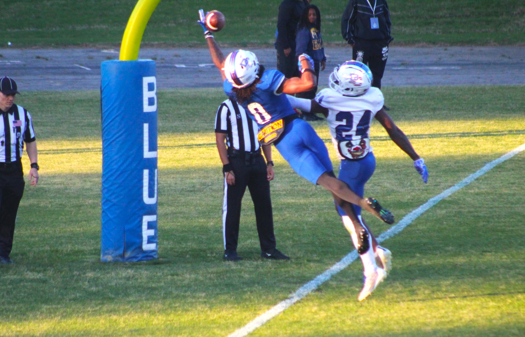The Blue preserved the victory by blocking a White field-goal try, returning a favor from early in the game.