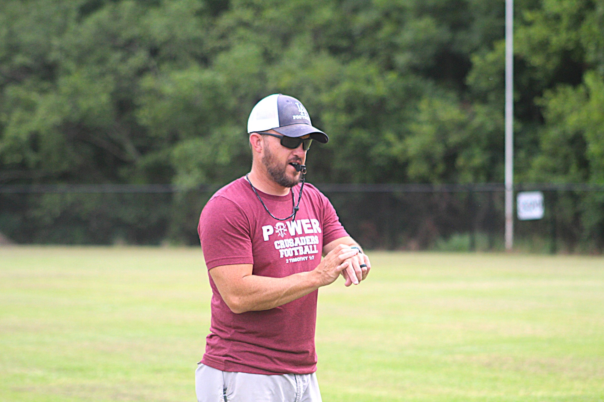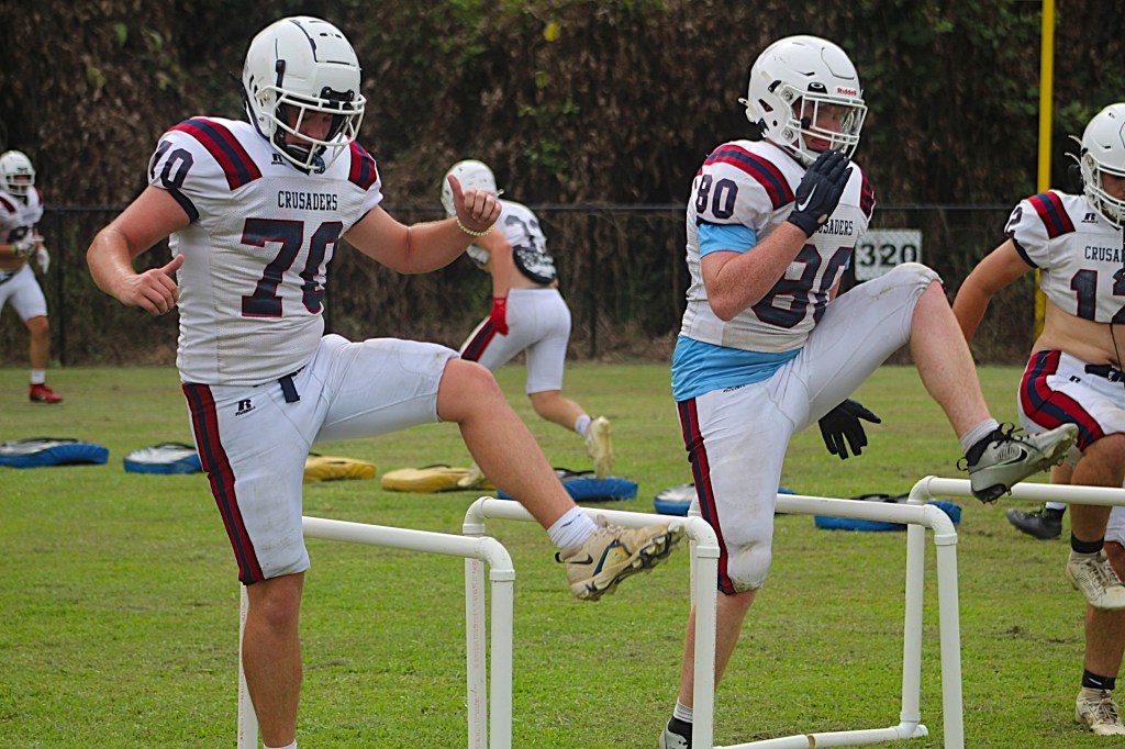 The Crusaders play football eight boys at a time. Head coach Jolly Doolittle and his two assistants put the team through its paces, teaching fundamentals diligently.