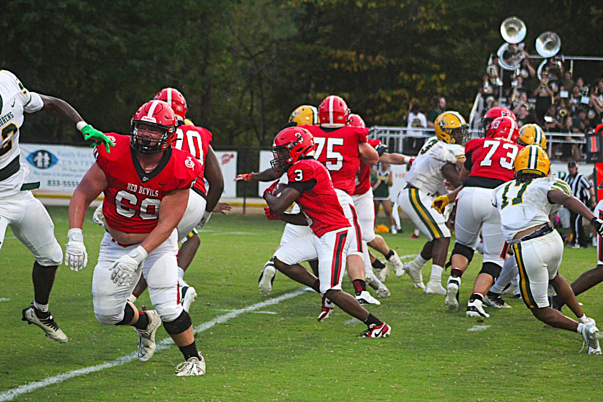 Red Devil runners wielded a sizzling fork of diversity and balance. Eight rushed, six of them – Javen Cook (15 carries, 89 yards), Angelo Cromer (6-63), D.J. Clark (7-50), Rhett Gilliam (9-35), Kason Copeland (5-35) and K.J. Vance (8-27) – quite notably.