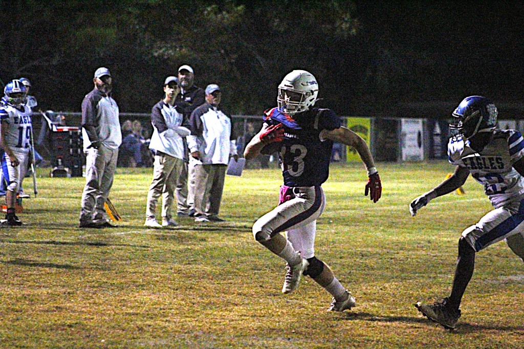 Laurens Academy puts on its trousers one leg at a time, plays its games one at a time, and only puts eight players on the field at a time. The Crusaders blitzed the Newberry Academy Eagles,36-6, and are now 6-2.