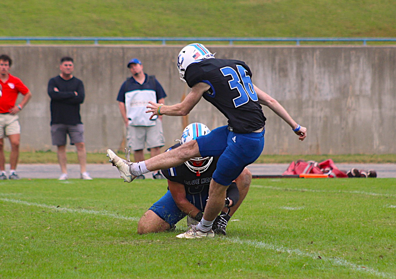 Four field goals in 28 points? Um, yes. PC did not score a conventional 28 points. The Blue Hose led, 5-0, early, and, 15-0, at halftime. Lipscombe kicked field of 37, 27, 22 and 34 yards.