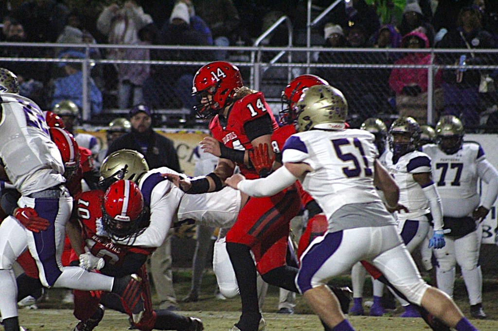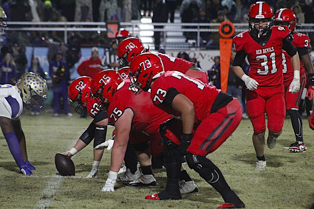Cook was the beneficiary of rugged line work, and the Red Devils’ ball distributor, senior quarterback Tushawan Richardson, actually made the game’s most spectacular and significant score. On fourth down and goal from the 9-yard line, Richardson looked to pass, feinted to do so, and made a banzai run down the right sideline, on the final play of the first half, diving into the end zone.