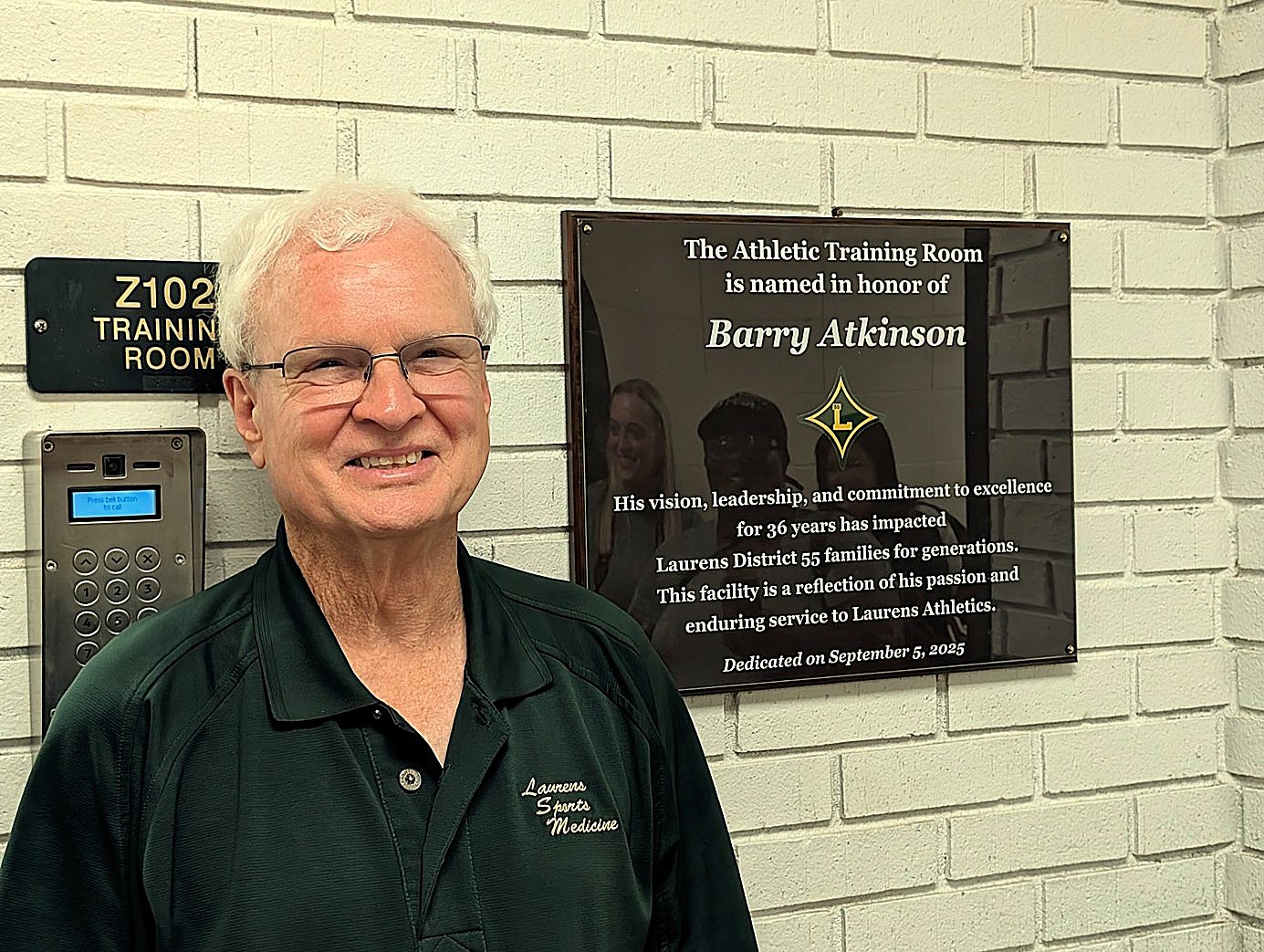 Barry Atkinson, who served Laurens District High School as athletics trainer for 36 years, received the honor of having the area where he helped heal Raider athletes named in his honor.