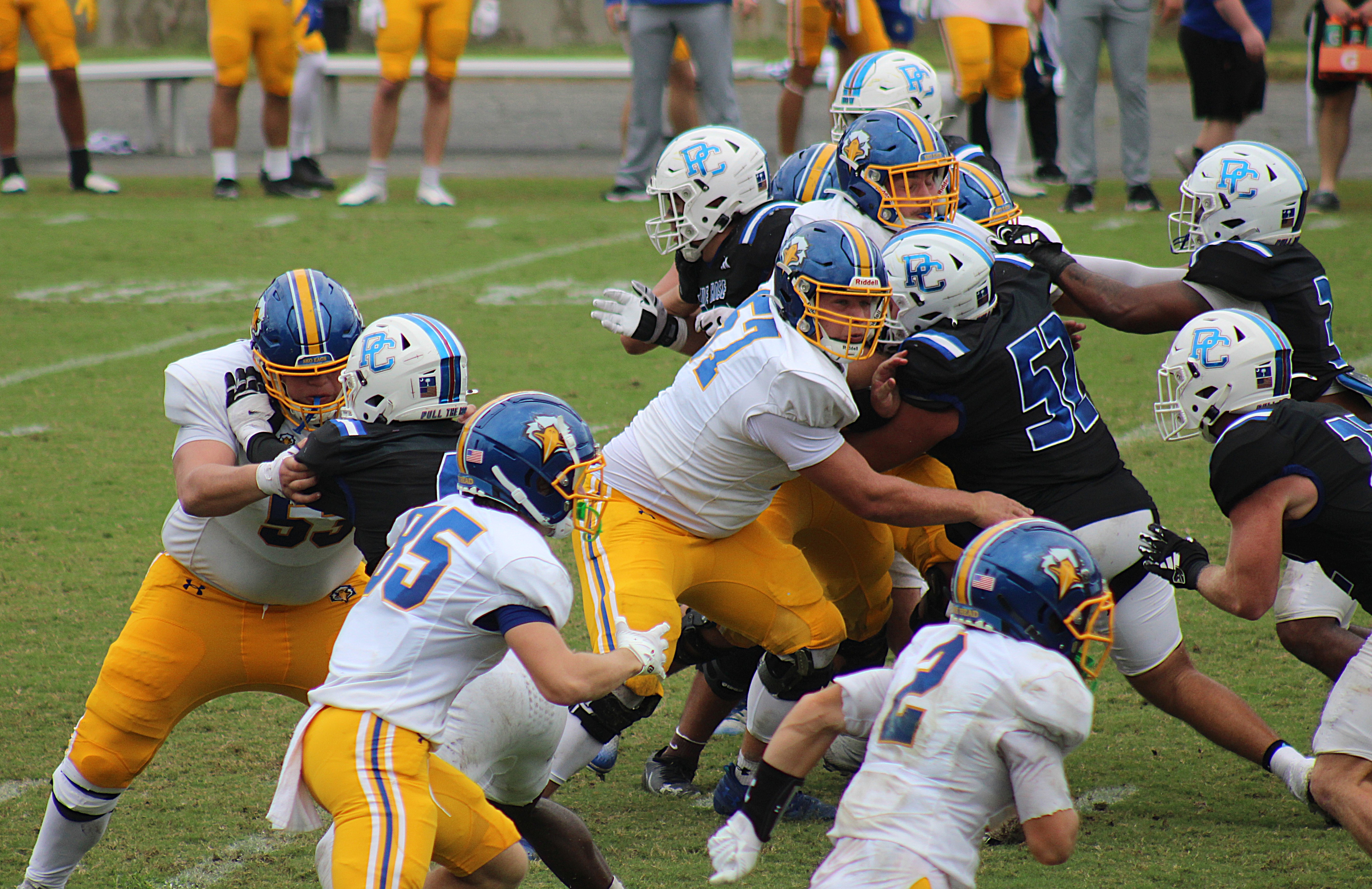 PC averaged 9.4 yards rushing as Justin Montgomery joined Switzer in triple digits with 106 yards in 13 carries. The Eagles averaged 3.4 yards on the ground, bolstered by Bryce Patterson, who managed 37 yards in three carries.