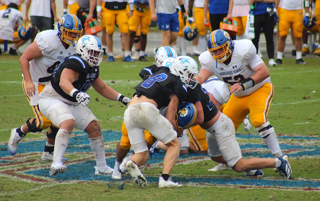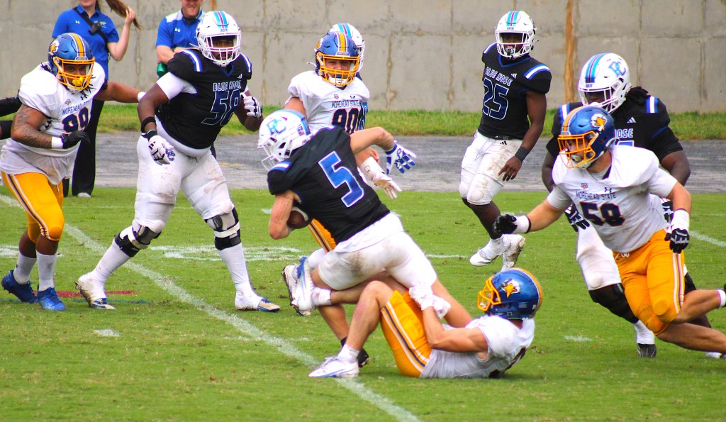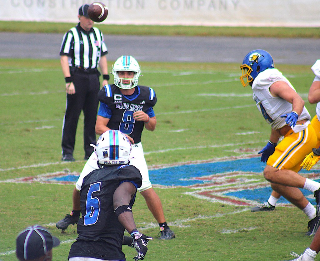 The Blue Hose don’t award scholarships in football. They play in the Pioneer Football League, which is made up of Division I schools that give athletic aid in other sports but not football.
