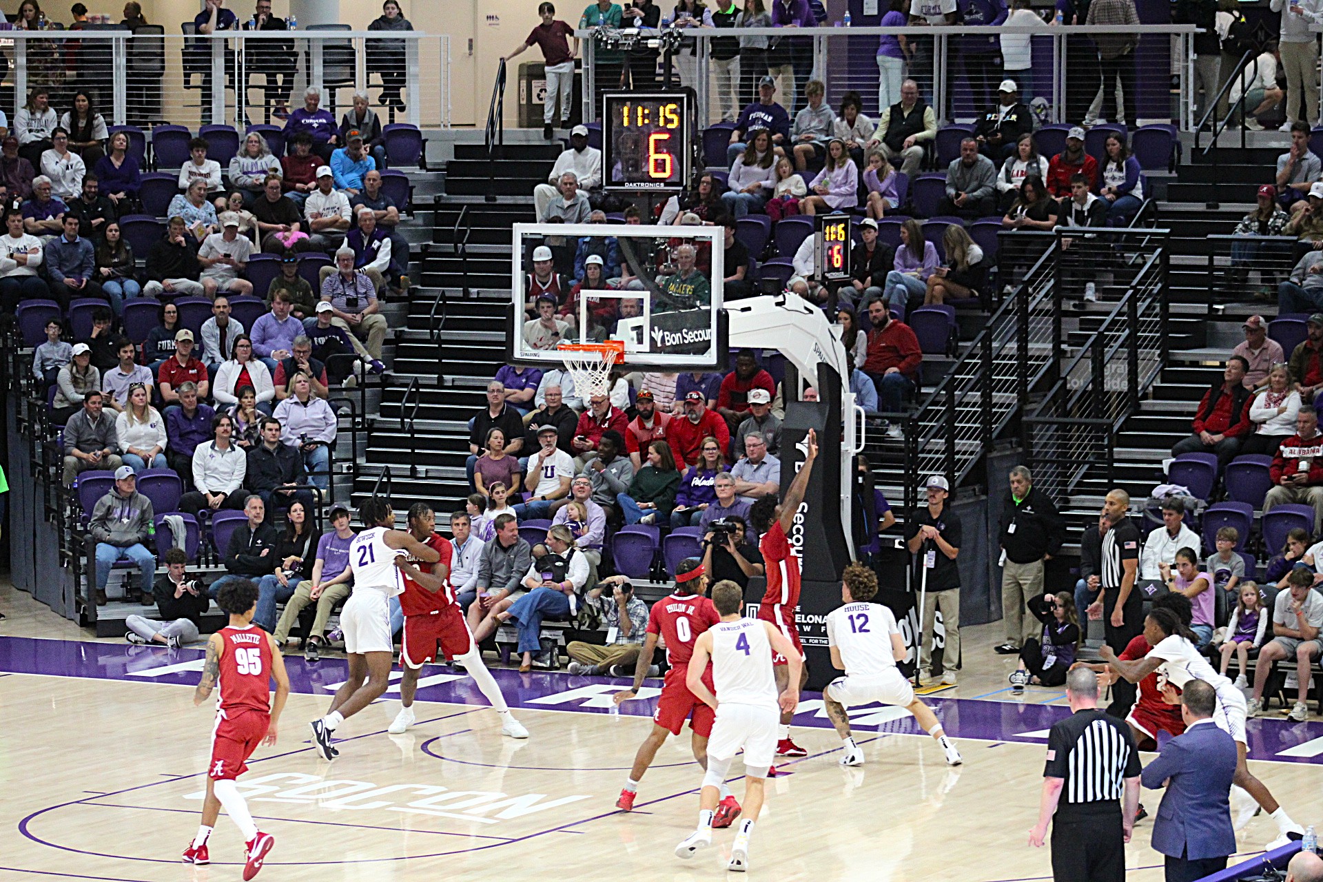 The Crimson Tide used a 9-0 run midway through the first half to erase an early deficit and take a 28-20 lead before carrying a 48-36 advantage into the half. After Alabama stretched its lead to 18 points early in the second half, Furman’s Charles Johnston drilled a triple with 12:35 to play in the game to cut the margin back to 12 at 63-51 with 12:35 to play.