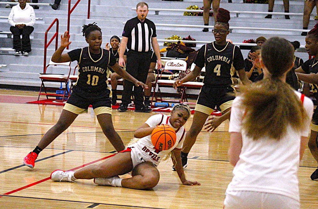 Before a reasonably competitive boys’ game, the girls (22-1, 7-0) dawdled only briefly, clobbering Columbia, 65-17. After a quarter, the Red Devils led by only two, 13-11. Columbia (8-10, 4-3) scored only six points in the rest the game. Clinton won the second quarter 21-2, the third 19-4 and the fourth 12-0.